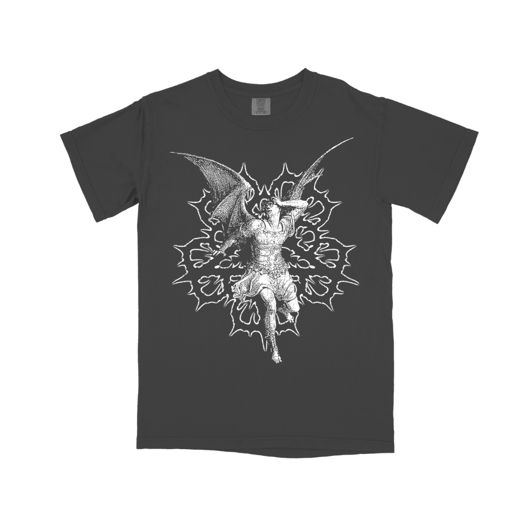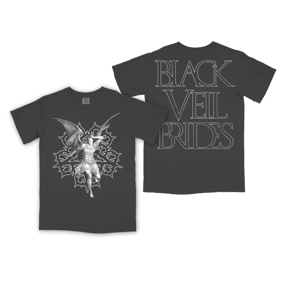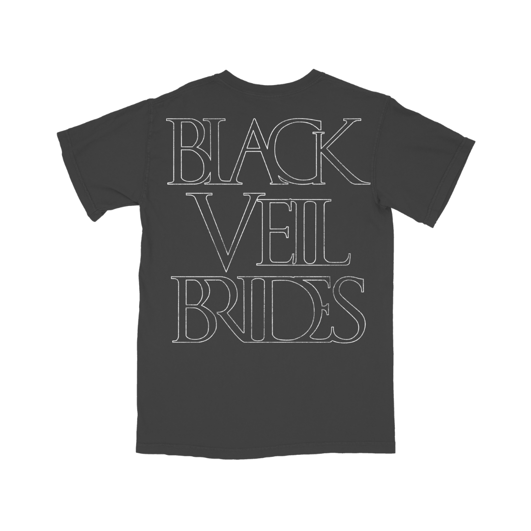 Premium 100% Comfort Colors cotton unisex charcoal t-shirt with a relaxed fit. The First Outcast artwork on front, "Black Veil Brides" on back.